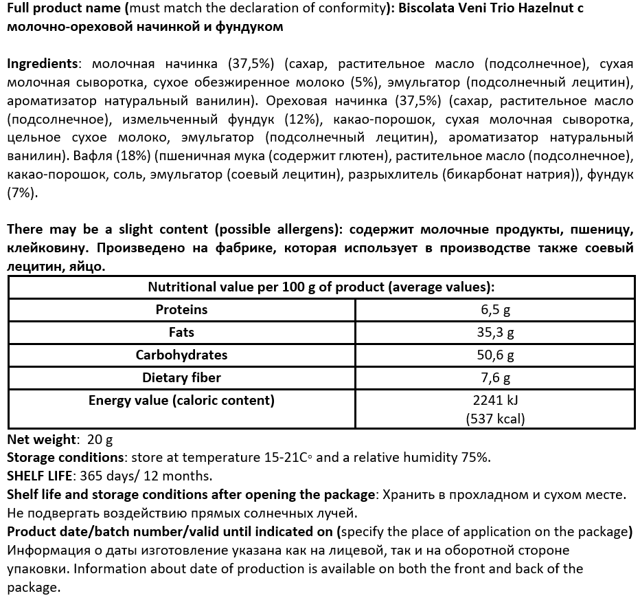 Вафля Biscolata Veni Trio Hazelnut с молочно-ореховой начинкой и фундуком, 20г х 24 шт