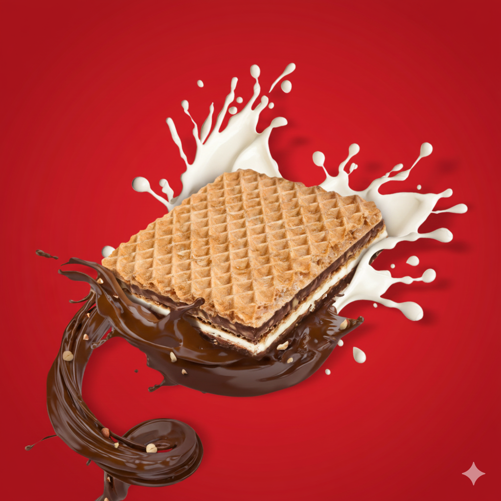 Молочная начинка (37,5%) (сахар, растительное масло (подсолнечное), сухая молочная сыворотка, сухое обезжиренное молоко (5%), эмульгатор (подсолнечный лецитин), ароматизатор натуральный ванилин); Ореховая начинка (37,5%) (сахар, растительное масло (подсолнечное), измельченный фундук (12%), какао-порошок, сухая молочная сыворотка, цельное сухое молоко, эмульгатор (подсолнечный лецитин), ароматизатор натуральной ванилин). Вафля (18%) (пшеничная мука (содержит глютен), растительное масло (подсолнечное), какао-порошок, соль, эмульгатор (соевый лецитин), разрыхлитель (бикарбонат натрия)), фундук (7%).