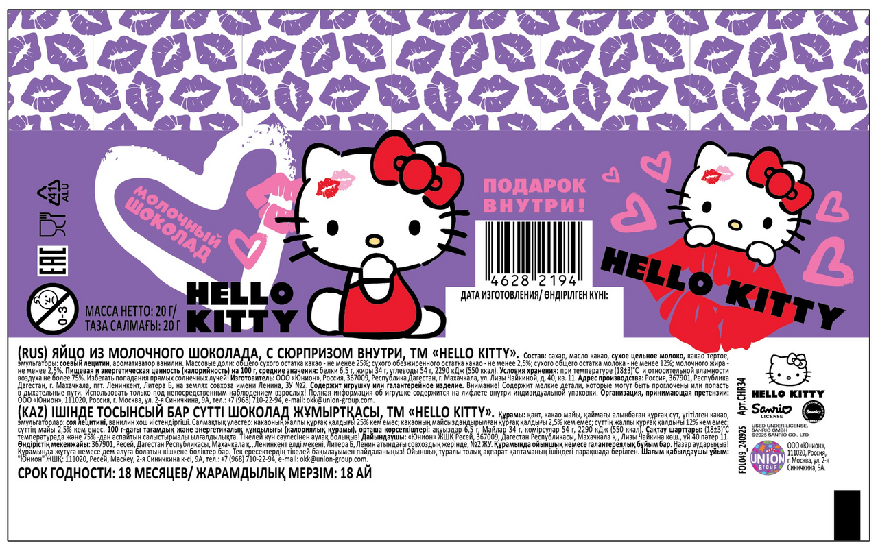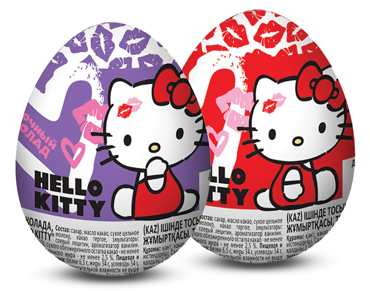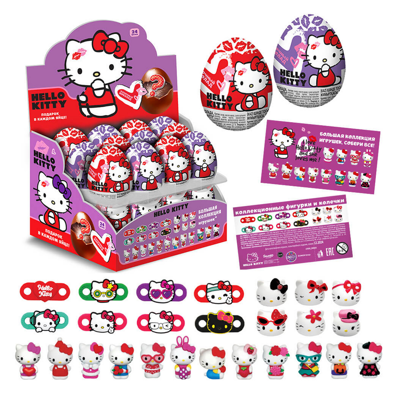 Яйцо Hello Kitty с сюрпризом, 20г x 24 шт - идеальный сюрприз для девочек. Нежный, тающий во рту молочный шоколад + игрушка внутри. В каждом яйце - игрушка.Коллекция из 12 милых детализированных тематических 3D игрушек из серии Веселые каникулы Hello Kitty.Коллекция из 6 стильных 3D колечек для настоящих модниц. Соберите все сюрпризы от Hello Kitty.
