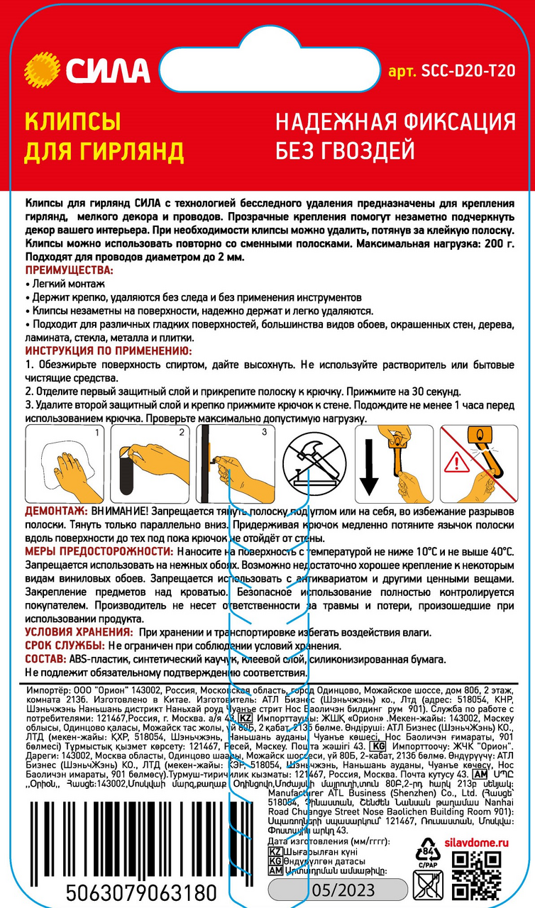Предназначена для крепления гирлянд и декоративных аксессуаров на стенах и потолке. Клипса изготовлена из прозрачного пластика, практически не заметна на поверхности и не портит интерьер. Легко фиксируется в нужных местах при помощи самоклеящихся полосок и удаляется, не оставляя следов.