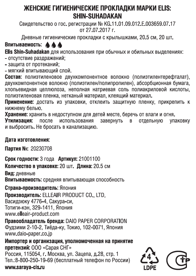 Дневные гигиенические прокладки с крылышками, 20.5см, 20шт. Впитываемость: 3 капли. Прокладки Elis Shin-Suhadakan для использования при обычных и обильных выделениях: - отсутствие раздражений; - защита от протеканий; - мягкий впитывающий слой. Дневные гигиенические прокладки с крылышками можно использовать при нормальных и обильных выделениях. Специальное углубление защищает от протекания в местах наибольшего скопления жидкости. Защитные бортики и высокая абсорбирующая способность дают надёжную защиту, а комфорт обеспечивается мягкой поверхностью прокладки. Изготовленные из современного дышащего материала, прокладки обеспечивают ощущение свежести.