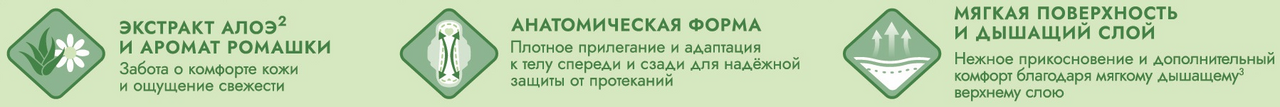 Наши прокладки с мягкой поверхностью и ароматом ромашки созданы для натуральной заботы о коже в интимной зоне, так как обогащены экстрактом алоэ. Благодаря анатомической форме прокладка плотно прилегает к телу и надежно защищает от протеканий. А мягкая поверхность и дышащий верхний слой обеспечивают комфортное соприкосновение с кожей.