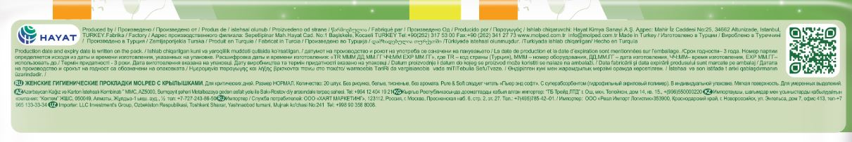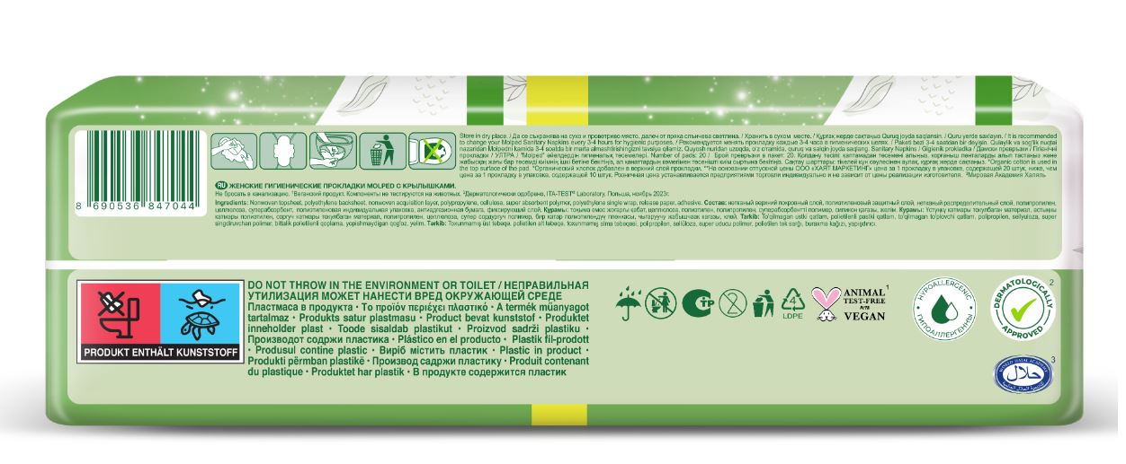Molped Pure&Soft c мягкой поверхностью и добавлением органического хлопка бережно относятся к коже, не вызывают раздражения и сыпи. Прокладки дерматологически протестированы и содержат 0% красителей, нейлона и хлора, обеспечивая максимальный комфорт твоей коже. Мягкая верхняя поверхность прокладок, изготовленная с добавлением органического хлопка, нежно соприкасается с кожей и не вызывает раздражений. Их впитывающий слой быстро поглощает влагу, а анатомическая форма обеспечивает плотное прилегание и свободу движений. Эти прокладки отличаются хорошей воздухопроницаемостью, что позволяет избежать парникового эффекта. Удобные крылышки помогают надежно зафиксировать прокладку на нижнем белье и снизить риск протеканий. Изделия не содержат нейлона, красителей и хлора, не шуршат при ходьбе, не имеют аромата.