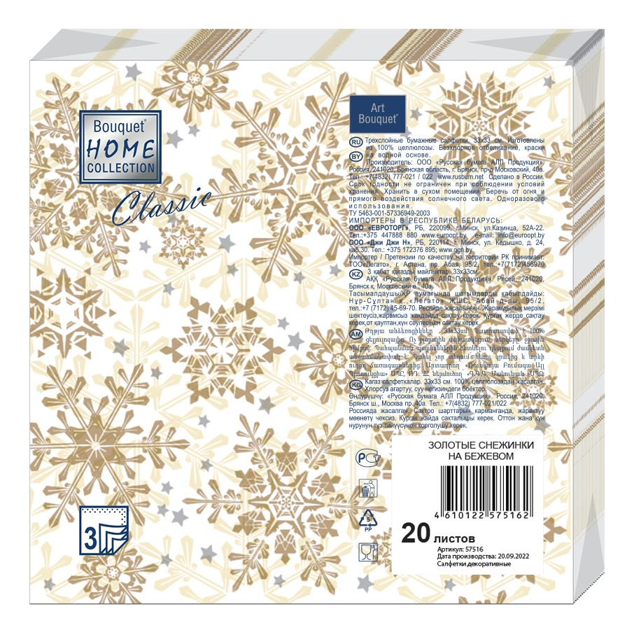Салфетки бумажные Bouquet Золотые снежинки 3 слоя 33 x 33см, 20шт