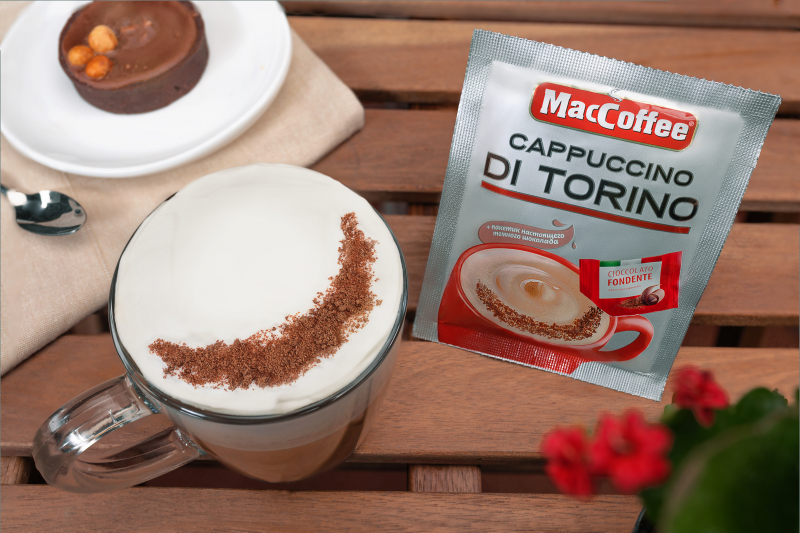 MacCoffee представляет Cappuccino di Torino, в основе которого лежит знаменитая рецептура из города Турин, Италия. Это превосходный капучино с настоящей шоколадной крошкой из темного бельгийского шоколада. Позволить себе напиток с итальянским акцентом можно где угодно и когда угодно. Чтобы приготовить капучино с высокой пенкой и крошкой темного шоколада сверху, не нужно быть бариста. Особый шарм MacCoffee Cappuccino di Torino придает крошка настоящего темного бельгийского шоколада Cioccolato Fondente, украшающая нежную кофейную пенку. MacCoffee и не наслаждаться им – это преступление. Cappuccino di Torino рожден соблазнять. Просто поддайся искушению и растворись во вкусе. Не стесняйся оригинальности, делай свой день!