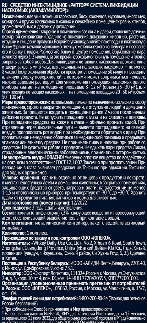 Аквафумигатор Раптор Система ликвидации насекомых, 210г