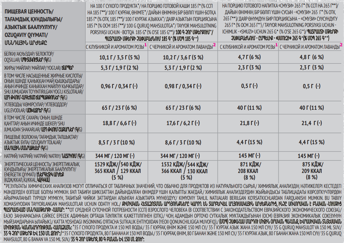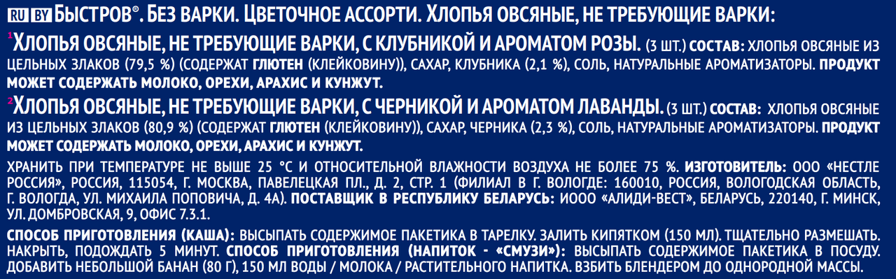 Хлопья овсяные, не требующие варки, с клубникой и ароматом розы: хлопья овсяные из цельных злаков содержат глютен клейковину, сахар, клубника, соль, натуральные ароматизаторы; Хлопья овсяные, не требующие варки, с черникой и ароматом лаванды: хлопья овсяные из цельных злаков содержат глютен клейковину, сахар, черника, соль, натуральные ароматизаторы.