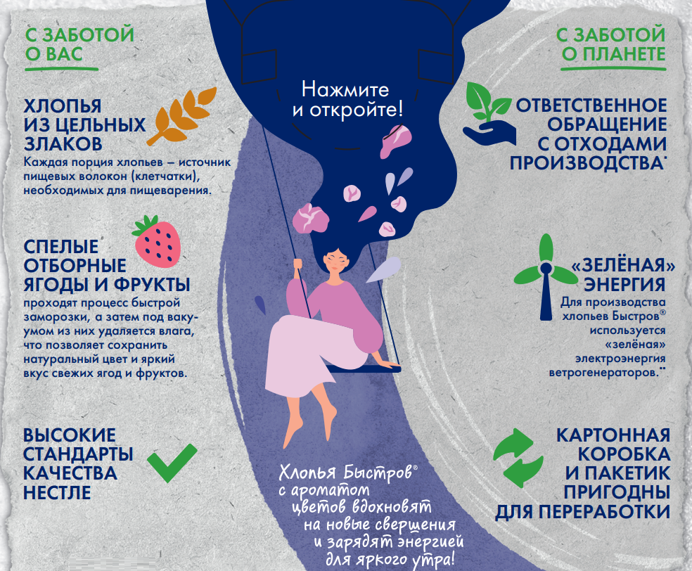 Начни утро вместе с Быстров Цветочное ассорти. Хлопья Быстров с ягодами и ароматом цветов вдохновят на новые свершения и зарядят энергией для яркого утра. Овсяные хлопья созданы только из качественных ингредиентов. Прежде чем попасть к нам в продукт, все ингредиенты проходят до 100 тестов. Основа - это натуральные хлопья из цельных злаков, в которых сохранены все компоненты овсяного зерна (оболочка, эндосперм и зародыш), а значит и полезные свойства. Каждая порция каши является источником пищевых волокон (клетчатки), необходимых для пищеварения. Спелые отборные кусочки ягод и фруктов проходят процесс быстрой заморозки, а затем под вакуумом из них удаляется влага. Данный метод позволяет сохранить структуру, цвет и вкус свежих ягод.