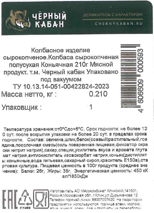 Колбаса Черный кабан Коньячная сырокопченая, 210г