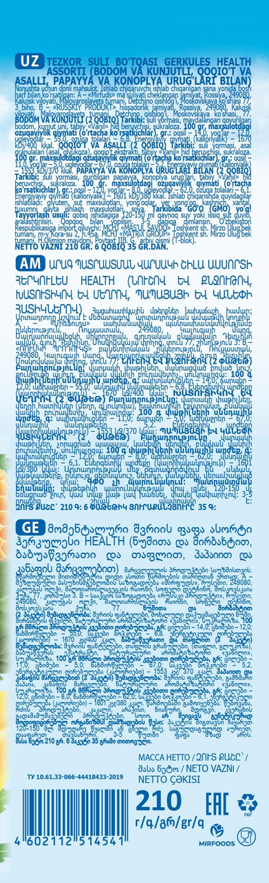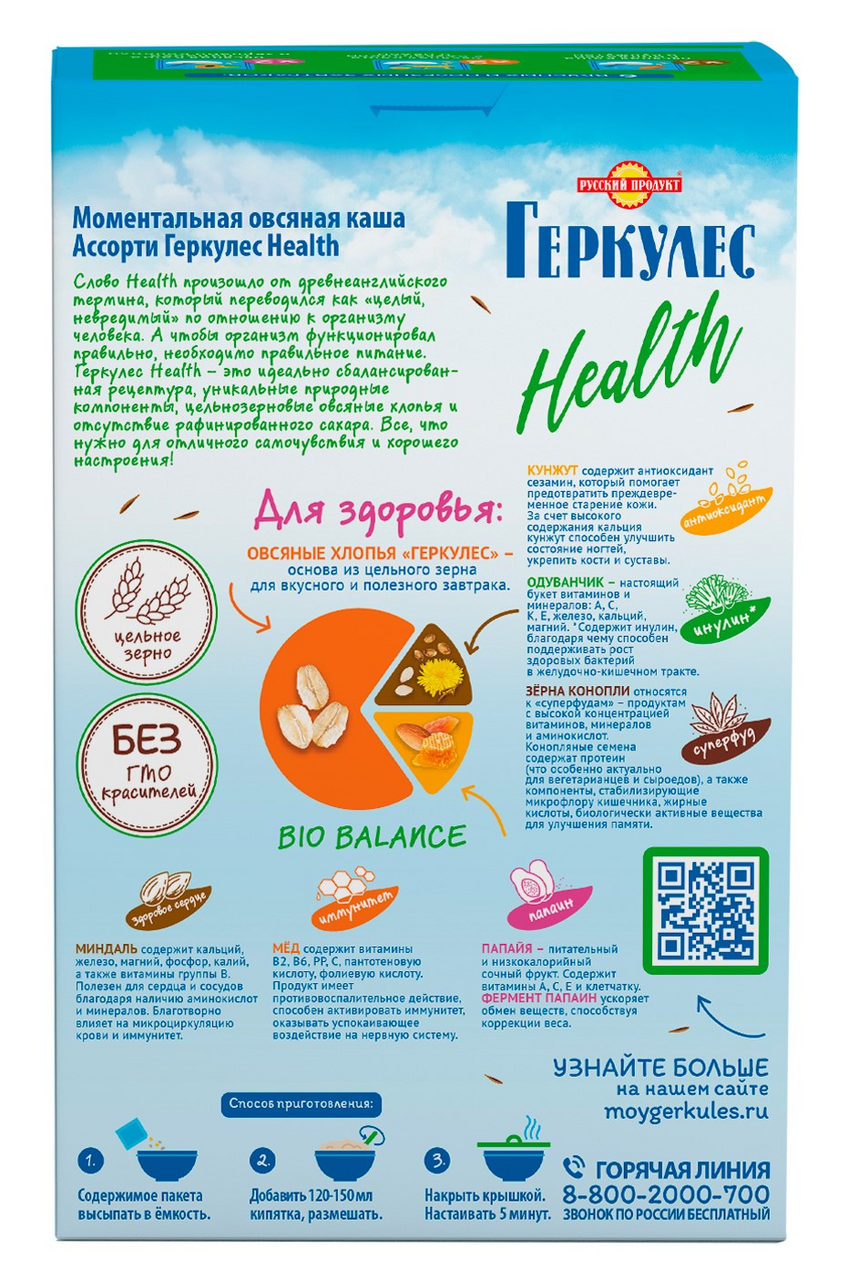 Слово Health произошло от древнеанглийского термина, который переводился, как целый, невредимый по отношению к организму человека. А чтобы организм функционировал правильно, необходимо правильное питание. Геркулес Health - это идеально сбалансированная рецептура, уникальные природные компоненты, цельнозерновые овсяные хлопья, и отсутствие рафинированного сахара. Зерно с деликатной технологией обработки сохраняют все целебные свойства натурального продукта, максимум полезных микроэлементов, минералов и витаминов, пищевого волокна в виде клетчатки. Овсяные хлопья необходимо залить горячей водой или молоком. Вкусная каша из хлопьев - полезный завтрак для людей, ведущих здоровый образ жизни и придерживающихся правильного питания, для похудения женщин и мужчин. Простое в приготовлении постное блюдо дополнит рацион взрослых, подростков - девушек и парней, детский рацион мальчиков и девочек, подойдет для веганов и вегетарианцев. Овсяные хлопья - низкокалорийная каша, которая радует длительным чувством сытости, безусловной пользой для организма: нормализацией процессов пищеварения, поддержанием высокого уровня энергии, выносливости и работоспособности, очищением от токсинов, укреплением иммунитета, улучшением сна. Регулярное употребление полезного продукта нормализует количество сахара и холестерина в крови, снижает риск сердечно-сосудистых заболеваний, приводит в норму работу эндокринной системы и улучшает обмен веществ.