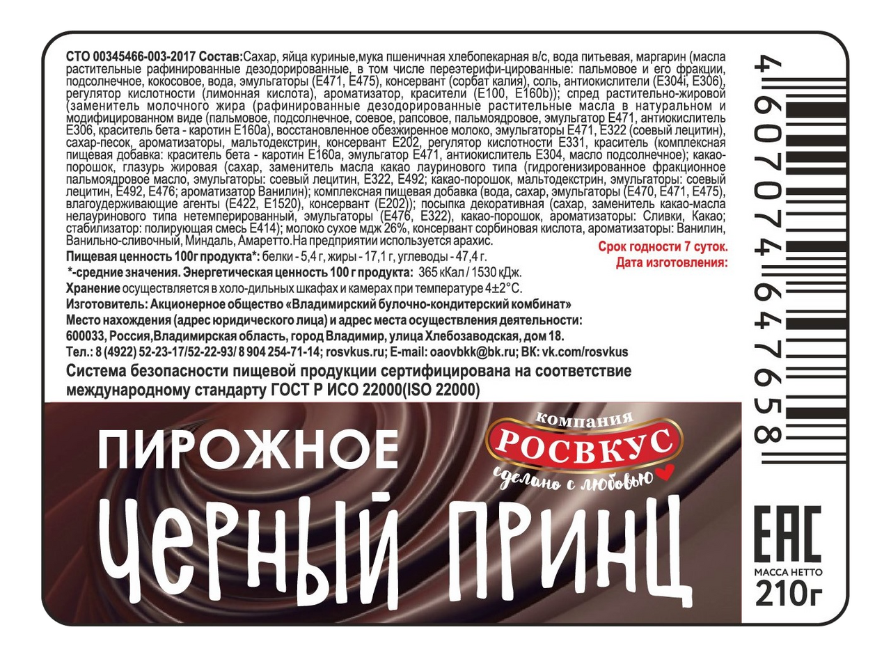 Сахар, яйца куриные, мука пшеничная хлебопекарная, вода питьевая, маргарин масла растительные рафинированные дезодорированные, в том числе переэтерифицированные: пальмовое и его фракции, подсолнечное, кокосовое, вода, эмульгаторы Е471, Е475, консервант сорбат калия, соль, антиокислители Е304i, Е306, регулятор кислотности лимонная кислота, ароматизатор, красители Е100, Е160b, спред растительно-жировой заменитель молочного жира рафинированные дезодорированные растительные масла в натуральном и модифицированном виде пальмовое, подсолнечное, соевое, рапсовое, пальмоядровое, эмульгатор Е471, антиокислитель Е306, краситель бета-каротин Е160а, восстановленное обезжиренное молоко, эмульгаторы Е471, Е322 соевый лецитин, сахар-песок, ароматизаторы, мальтодекстрин, консервант Е202, регулятор кислотности Е331, краситель комплексная пищевая добавка: краситель бета-каротин Е160а, эмульгатор Е471, антиокислитель Е304, масло подсолнечное, какао-порошок, глазурь жировая сахар, заменитель масла какао лауринового типа гидрогенизированное фракционное пальмоядровое масло, эмульгаторы: соевый лецитин, Е322, Е492; какао-порошок, мальтодекстрин, эмульгаторы: соевый лецитин, Е492, Е476, ароматизатор Ванилин, комплексная пищевая добавка вода, сахар, эмульгаторы Е470, Е471, Е475, влагоудерживающие агенты Е422, Е1520, консервант Е202, посыпка декоративная сахар, заменитель какао-масла нелауринового типа нетемперированный, эмульгаторы Е476, Е322, какао-порошок, ароматизаторы: Сливки, Какао, стабилизатор: полирующая смесь Е414; молоко сухое, консервант сорбиновая кислота, ароматизаторы: Ванилин, Ванильно-сливочный, Миндаль, Амаретто.