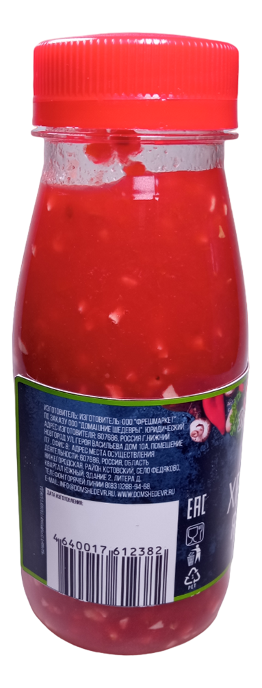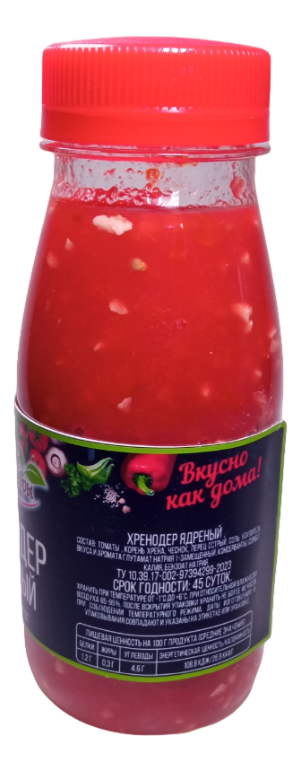 Томаты свежие, хрен свежий, чеснок, пищевая поваренная соль, перец красный молотый, сахар, консервант E260 (уксусная кислота), консервант E202 (сорбат калия).