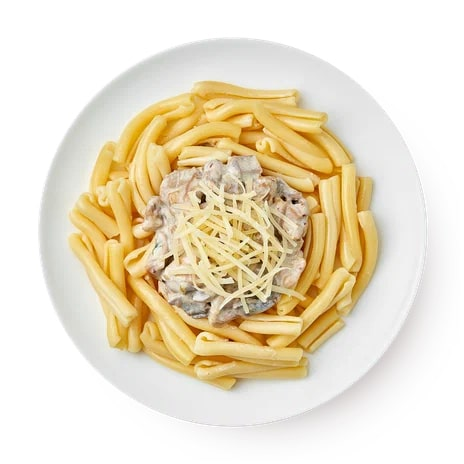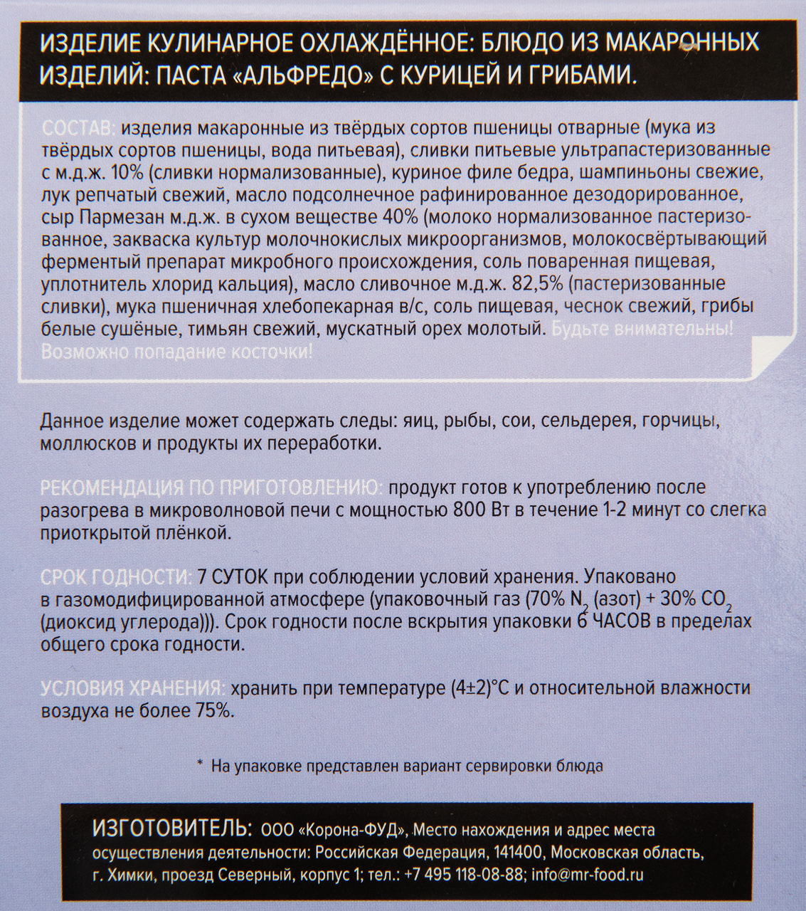 Изделия макаронные из твёрдых сортов пшеницы отварные (мука из твёрдых сортов пшеницы, вода питьевая), сливки питьевые ультрапастеризованные с м. д. ж. 10% (сливки нормализованные), куриное филе бедра, шампиньоны свежие, грибы белые быстрозамороженные, лук репчатый свежий, масло подсолнечное рафинированное дезодорированное, сыр Пармезан м. д. ж. в сухом веществе 40% (молоко нормализованное пастеризованное, закваска культур молочнокислых микроорганизмов, молокосвёртывающий ферментый препарат микробного происхождения, соль поваренная пищевая, уплотнитель хлорид кальция), масло сливочное м. д. ж. 82,5% (пастеризованные сливки), мука пшеничная хлебопекарная в/с, соль пищевая, чеснок свежий, грибы белые сушёные, тимьян свежий, мускатный орех молотый. Будьте внимательны! Возможно попадание косточки. Может содержать следы: сои, яйца, рыба, горчицы, сельдерея, моллюсков и продукты их переработки.