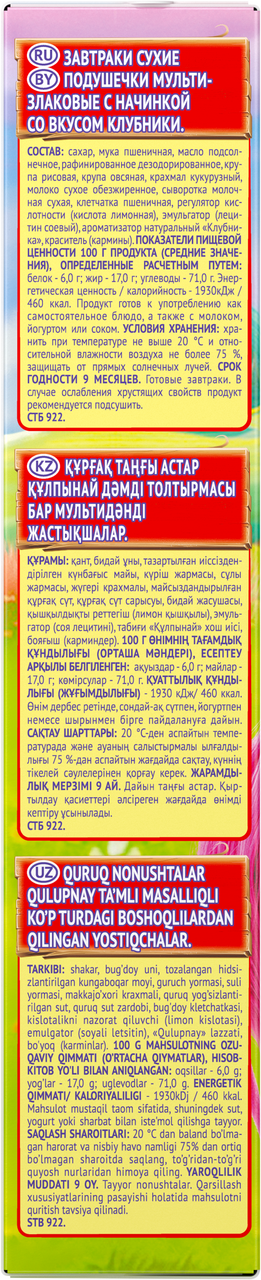 Подушечки мультизлаковые с клубничной начинкой - это вкусный и полезный завтрак, который привлечет внимание вашего ребенка. Детские продукты - это сочетание качества, пользы и удобства. Любимые и привычные вкусы, удивительный и интересный мир глазами ребенка, попробовать новое и интересное, также забота о ребенке, внешний вид, который понравится ребенку, натуральный и чистый состав, а так же возможность купить детские продукты для себя, не задумываясь.
