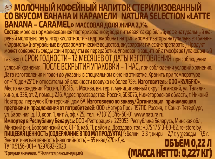 Напиток молочно-кофейный Natura selection Latte Банан-карамель, 220 мл (без заменителя молочного жира) – идеальный вариант, когда так хочется бодрящего кофе, но нет времени или условий для его приготовления. Капучино обладает приятным ванильным ароматом и нежным сливочным вкусом, в меру сладкий. Яркий бананово-карамельный латте поможет легко проснуться утром и взбодриться, настроиться на рабочий лад и быть в тонусе в течение всего дня. При желании напиток можно немного подогреть. Он отлично сочетается со свежей выпечкой, а также с круассанами с сытной начинкой, с сэндвичами и бутербродами, с тостами и тарталетками, с омлетом и сырниками, с запеканкой и другим продуктами. Самое главное – вам не нужно время на его приготовление и на то, чтобы идти в кофейню. Просто откройте баночку с напитком и насладитесь вкусом этого оригинального молочно-кофейного напитка.