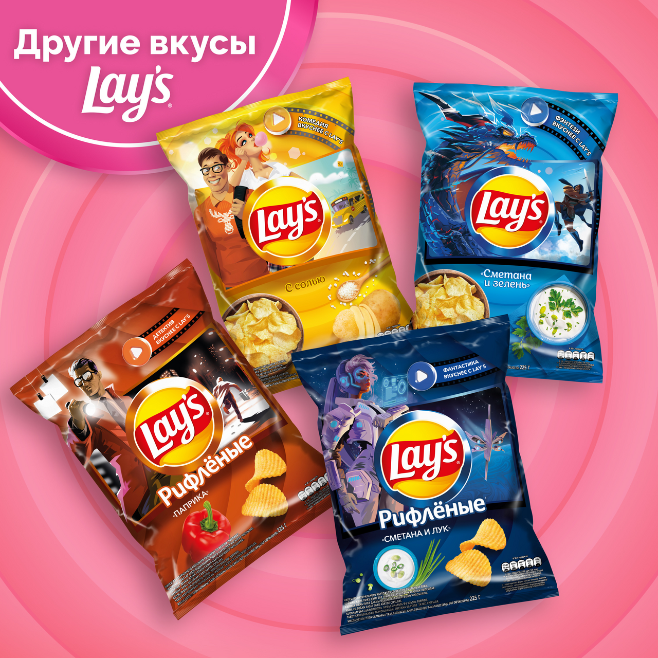 Lay's — чипсы, каждая пачка которых изготовлена из специально отобранного картофеля и соответствует самым высоким стандартам качества. Хрустящие и легкие на вкус картофельные чипсы Lay's были созданы, чтобы вызвать улыбку на лице каждого человека, поэтому ими так приятно делиться с лучшими друзьями. Чипсы Lay's, несомненно, скрасят ваш день!