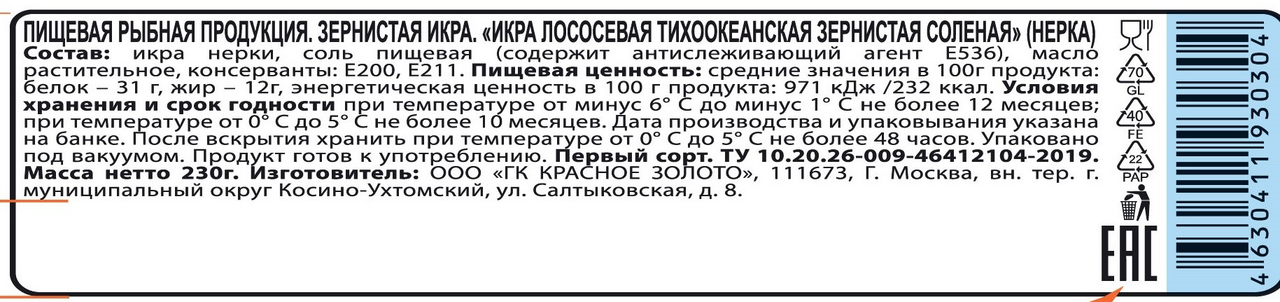 Икра нерки, соль пищевая содержит антислеживающий агент е536, масло растительное, консерванты е200, e211.