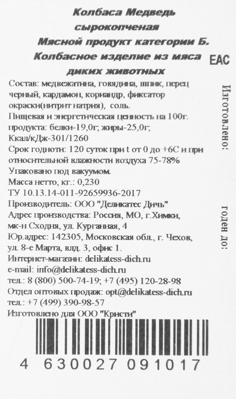 Колбаса Деликатес дичь медведь сырокопченая, 230г