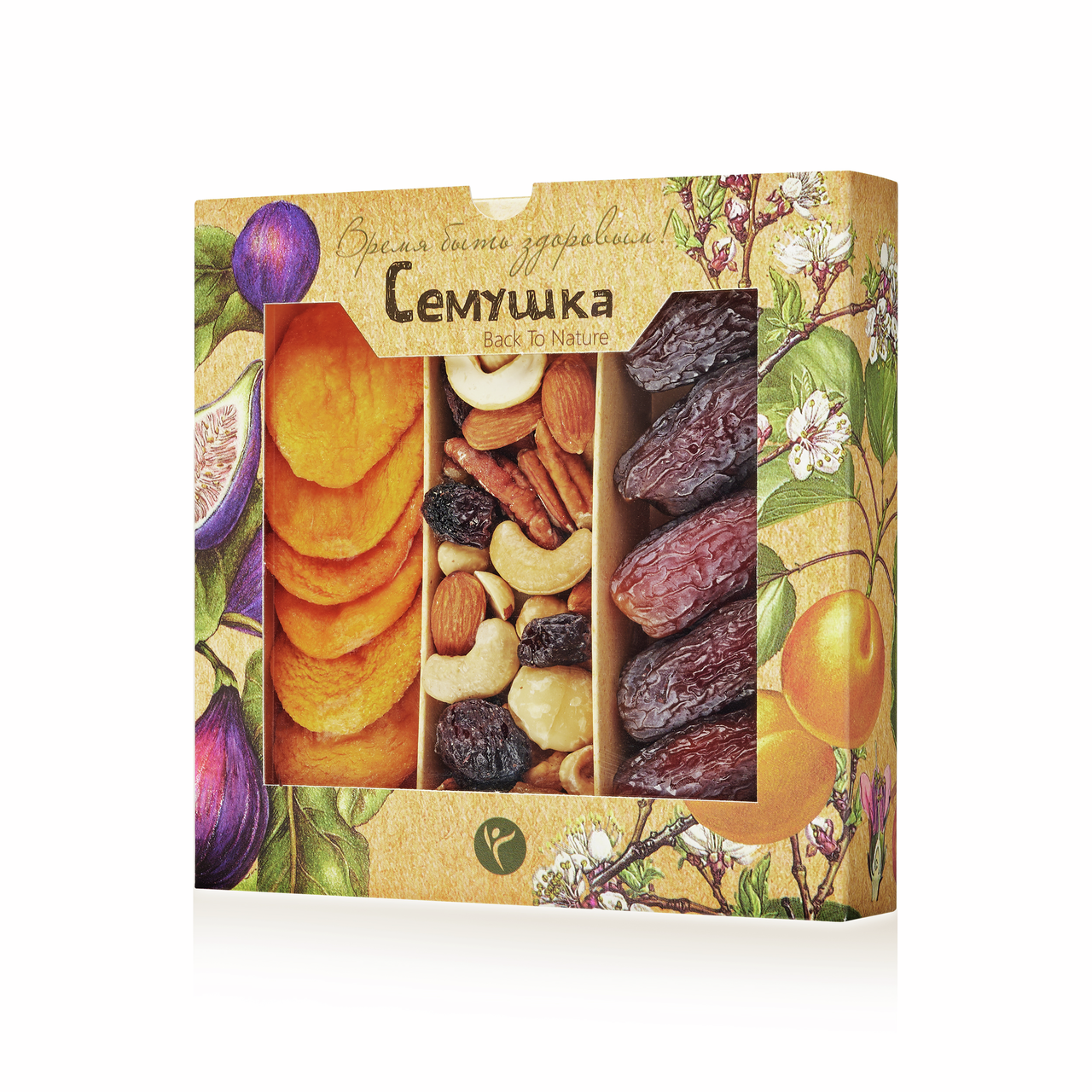 Набор орехов с королевскими финиками и персиками Семушка содержит жареные ядра орехов миндаля, кешью, фундука, пекана, макадамии. Такой набор заменит привычные сладости. Идеально для подарка близким и родным, деловым партнерам и знакомым.