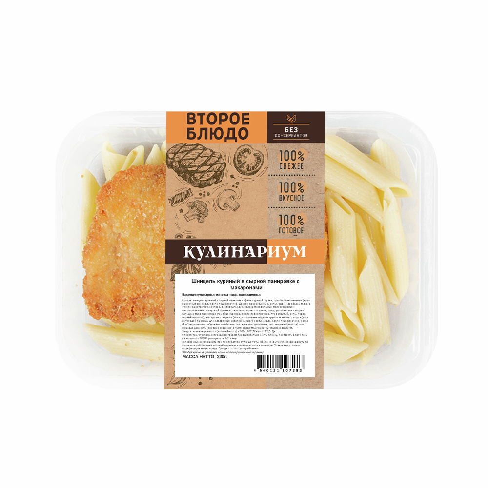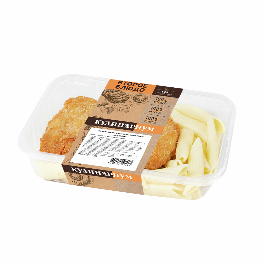 Шницель куриный в сырной панировке (филе куриной грудки, сухари панировочные (мука пшеничная в/с, вода, масло подсолнечное, дрожжи прессованные, соль), сыр Пармезан м.д.ж. в сухом веществе 45% (молоко, бактериальная закваска мезофильных молочнокислых микроорганизмов, сычужный фермент животного происхождения, соль, уплотнитель - хлорид кальция), мука пшеничная в/с), яйцо куриное, масло подсолнечное, лук репчатый, соль, перец черный молотый), макароны отварные (вода, макаронные изделия группы А высшего сорта (мука из твердой пшеницы для макаронных изделий высшего сорта, вода), масло подсолнечное, соль).