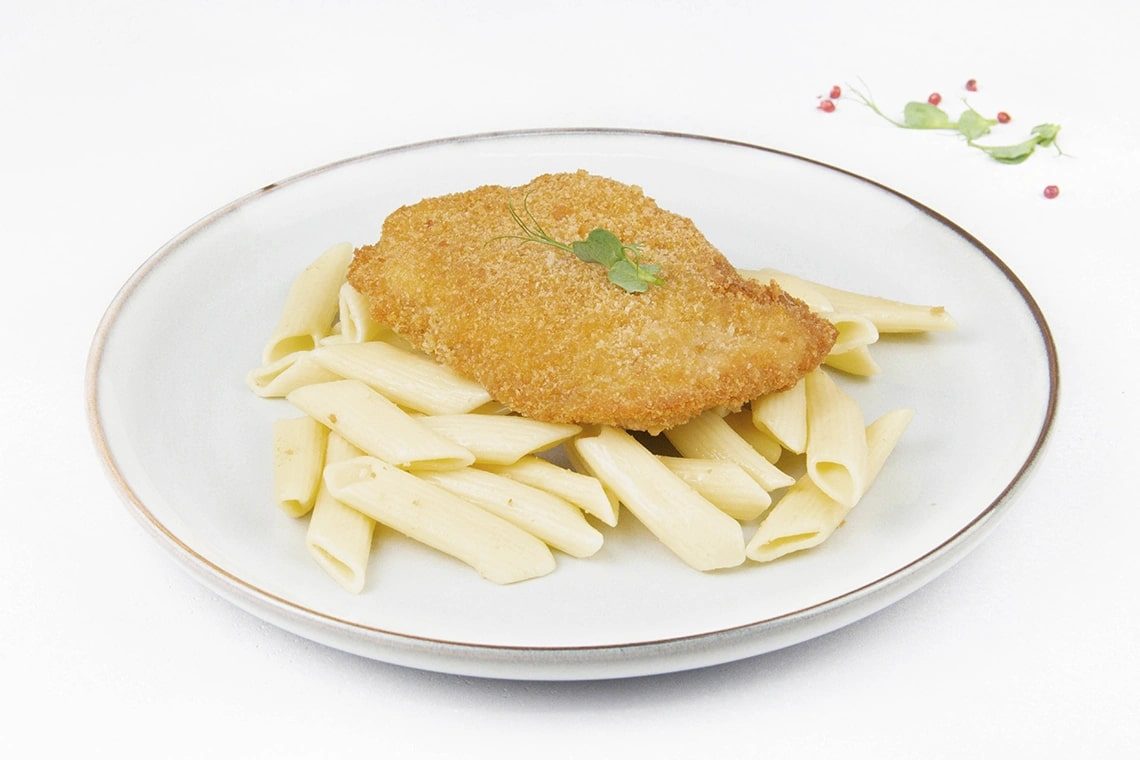 Куриное филе в хрустящей сырной корочке с макаронами на гарнир, а натуральный пармезан придаёт вкусу мяса пряные сырные нотки. Замечательно подходит для сытного домашнего обеда.Сочное филе куриной грудки в панировочных сухарях с добавлением сыра Пармезан обжарено до хрустящей золотистой корочки. На гарнир к шницелю идут макароны из твердых сортов пшеницы. Просто разогрейте блюдо на сковороде или в микроволновой печи