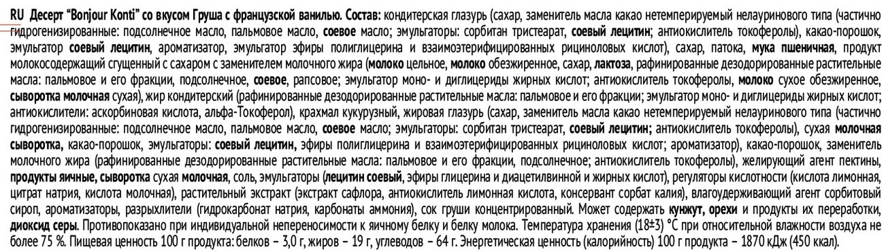 Кондитерская глазурь (сахар, заменитель масла какао нетемперируемый нелауринового типа (частично гидрогенизированные: подсолнечное масло, пальмовое масло, соевое масло; эмульгаторы: сорбитан тристеарат, соевый лецитин; антиокислитель токоферолы), какао-порошок, эмульгатор соевый лецитин, ароматизатор, эмульгатор эфиры полиглицерина и взаимоэтерифицированных рициноловых кислот), сахар, патока, мука пшеничная общего назначения, продукт молокосодержащий сгущенный с сахаром с заменителем молочного жира, жир кондитерский (рафинированные дезодорированные растительные масла: пальмовое и его фракции; эмульгатор моно- и диглицериды жирных кислот; антиокислители: аскорбиновая кислота, альфа-Токоферол), крахмал кукурузный, жировая глазурь (сахар, заменитель масла какао нетемперируемый нелауринового типа (частично гидрогенизированные: подсолнечное масло, пальмовое масло, соевое масло; эмульгаторы: сорбитан тристеарат, соевый лецитин; антиокислитель токоферолы), сухая молочная сыворотка, какао-порошок, эмульгаторы: соевый лецитин, эфиры полиглицерина и взаимоэтерифицированных рициноловых кислот; ароматизатор), какао-порошок, заменитель молочного жира (рафинированные дезодорированные растительные масла: пальмовое и его фракции, подсолнечное; антиокислитель токоферолы), желирующий агент пектины, продукты яичные, сыворотка сухая молочная, соль, эмульгаторы, регуляторы кислотности (кислота лимонная, цитрат натрия, кислота молочная), растительный экстракт, влагоудерживающий агент сорбитовый сироп, ароматизаторы, разрыхлители (гидрокарбонат натрия, карбонаты аммония), сок груши концентрированный. Может содержать кунжут, орехи и продукты их переработки, диоксид серы.