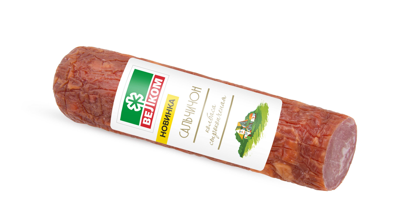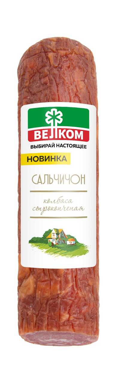 Колбаса сырокопченая Велком Сальчичон – выдержанный мясной деликатес с благородным насыщенным вкусом, гармонично дополненным пряными нотами. Это отличный выбор для праздничной нарезки, вкусных бутербродов в дорогу, мини-закусок к игристым и пенным напиткам.