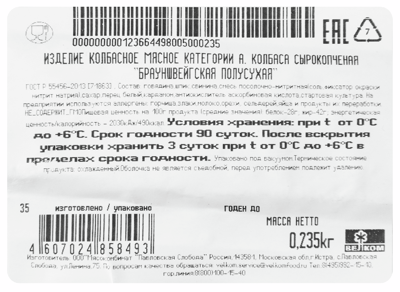Колбаса Велком Брауншвейгская сырокопченая, 235г представляет собой мясной продукт, который обладает насыщенным, пикантным вкусом, мраморным срезом с вкраплениями мелких кусочков шпика, приятным ароматом и упругой структурой. Он готовится по особому рецепту из натуральных ингредиентов высокого качества – смеси говядины и свинины с добавлением небольшого количества различных приправ – перца, кардамона, кориандра, имбиря, чеснока, горчицы и т. д. Мясное изделие не содержит сои, ГМО и других вредных добавок. Во время нарезки колбаса не теряет своей формы и не пачкает руки. Она эффектно будет смотреться в любой мясной тарелке, подаваемой к обеденному или праздничному столу. Аккуратные, ровные ломтики мясного изделия отлично дополнят бутербро��, пиццу или канапе. Колбаса хорошо сочетается с сырами, хлебобулочными изделиями, зеленью, жареным луком и т. д.
