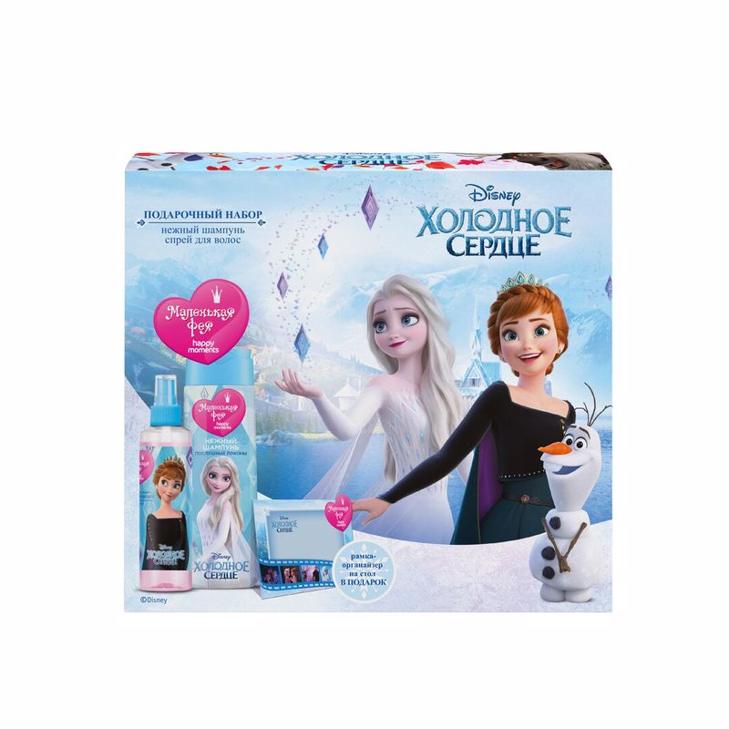 Подарочный набор Happy Moments Маленькая фея с дизайном Холодное сердце – долгожданный подарок для каждой девочки! Любимые герои из Холодного сердца и качественные продукты для красоты детских волос и создания волшебных причесок: нежный шампунь для волос и спрей для легкого расчесывания. В наборе есть приятное дополнение – волшебная рАмка-органайзер для фотографий. Соберите ее вместе – ведь время, проведенное всей семьей – это и есть настоящие счастливые моменты.