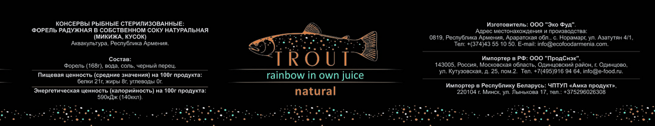 Это натуральный состав. Сырье всегда свежее и экологически безупречное. Продукт отличается высокими качественными и вкусовыми характеристиками, так как не содержит искусственных вкусовых добавок химического эффекта. Форель, консервированная в собственном соку, отличается деликатным вкусом. Обладает нежностью, мягкостью и деликатным вкусом с пряными нотками свежемолотого черного перца. Рекомендуется использовать для приготовления легких сэндвичей, а также добавлять в салаты и горячие блюда.