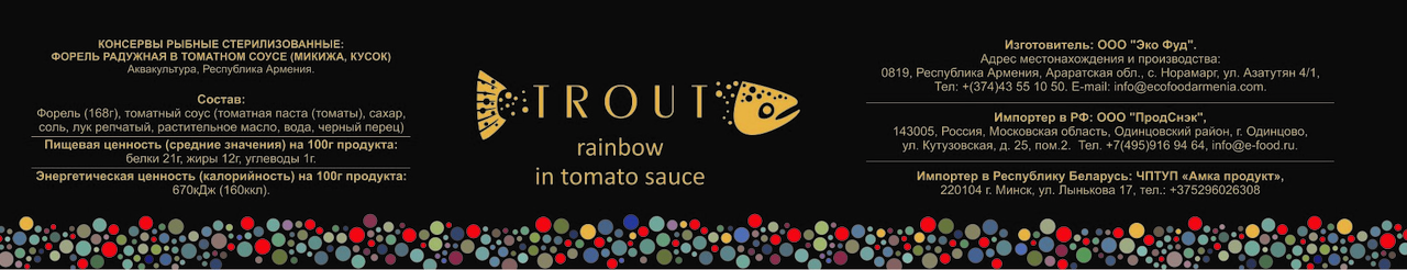 Это натуральный состав. Сырье всегда свежее и экологически безупречное. Продукт отличается высокими качественными и вкусовыми характеристиками, так как не содержит искусственных вкусовых добавок химического эффекта. Сочные и нежные кусочки филе радужной форели, законсервированные в собственном соку с добавлением спелых томатов, ароматного черного перца и соли. Рекомендуется использовать для приготовления супов, а также салатов и других закусок.