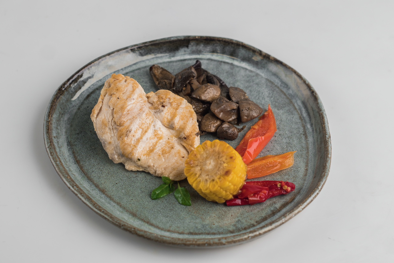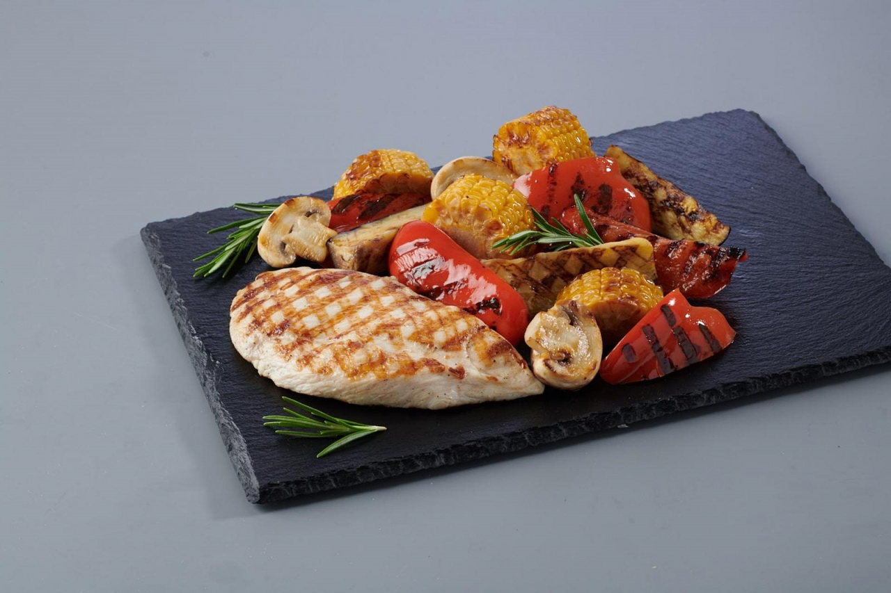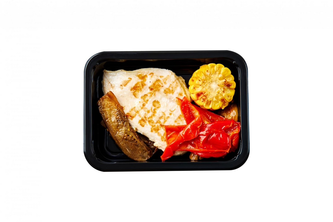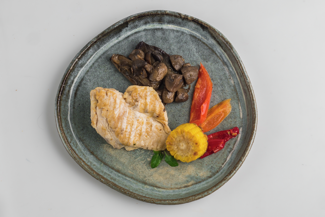 Куриное филе грудки, грибы шампиньоны свежие культивируемые, кукуруза десертная в початках замороженная, баклажаны свежие, перец сладкий свежий.