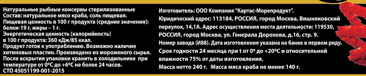 Крабовое мясо – это наслаждение для гурманов, кроме изысканного вкуса оно ещё и очень полезное для организма. В морепродукте содержатся витамины: В1, В2, В3, В5, В6, В9, В12, А, РР, также макро-и микроэлементы: селен, кальций, фтор, цинк, магний, фосфор, калий, железо.