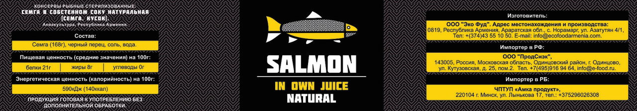 Это натуральный состав. Сырье всегда свежее и экологически безупречное. Продукт отличается высокими качественными и вкусовыми характеристиками, так как не содержит искусственных вкусовых добавок химического эффекта. Семга является одной из самых ценных и известных промысловых рыб. Ее нежное розовое мясо обладает высокой питательной и вкусовой ценностью, относится к деликатесам. В семге содержатся уникальные жиры и кислоты, а также фосфор, калий, кальций и множество других ценных веществ. Консервированная семга в собственном соку - сытный и вкусный перекус или закуска. Консервы премиум-качества абсолютно натуральны и не содержат вредных добавок.