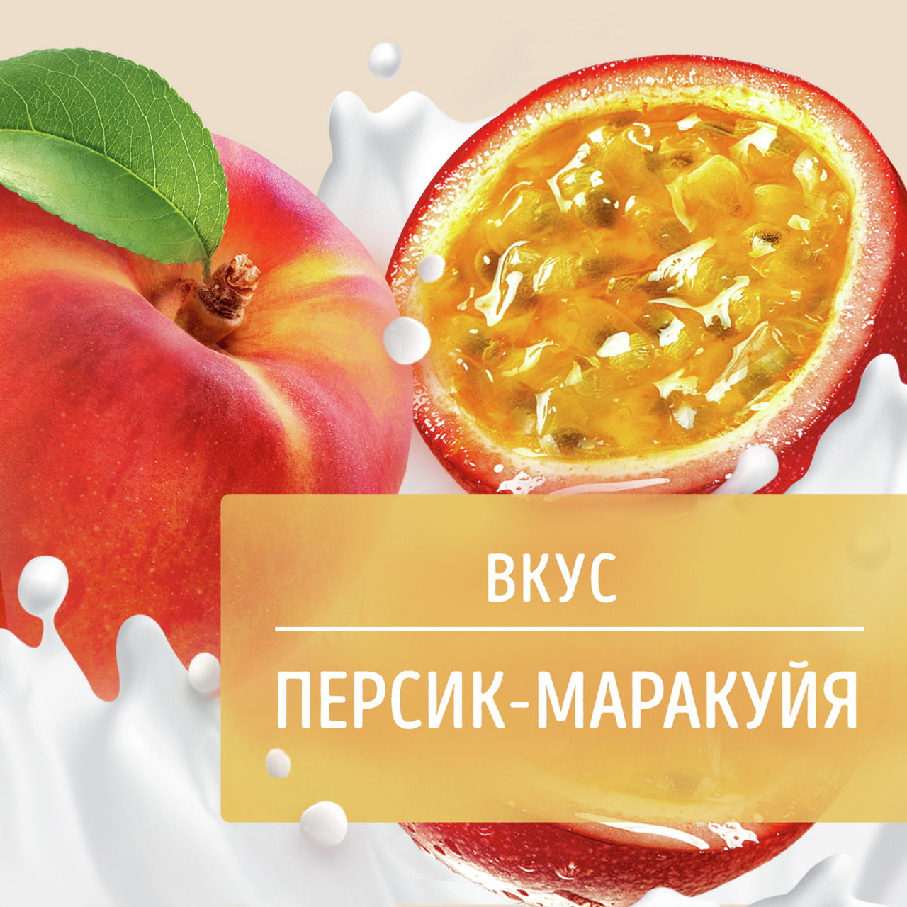 Молоко нормализованное, молоко восстановленное В*, фруктовый наполнитель Персик-маракуйя вода, персик, сахар, стабилизатор Е1442 H* или стабилизатор Е1422 T* или кукурузный крахмал X*, глюкозно-фруктозный сироп G*, концентрированный сок из маракуйи, стабилизатор - пектины P*, ароматизаторы, краситель - аннато, регуляторы кислотности лимонная кислота, цитрат натрия 3-замещенный, сахар, стабилизаторы Е1422, гуаровая камедь, желатин, закваска. *- при использовании данного компонента в маркировке указывается соответствующая ему буква. Продукт может содержать фрагменты косточек.