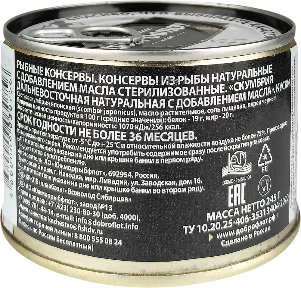 Скумбрия дальневосточная Доброфлот натуральная с маслом, 245г