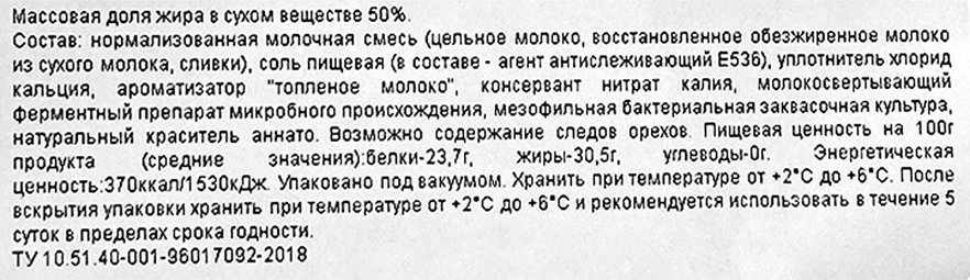 Нормализованное молоко, восстановленное молоко, соль пищевая, ароматизатор топленое молоко, консервант нитрат калия, молокосвертывающий ферментный препарат микробного происхождения, мезофильная бактериальная заквасочная культура, натуральный краситель аннато.