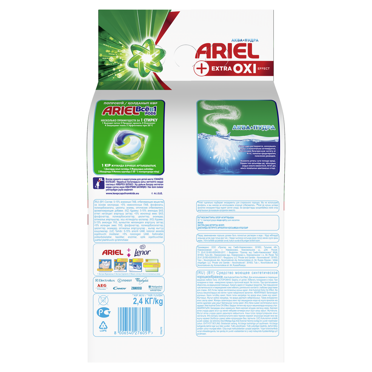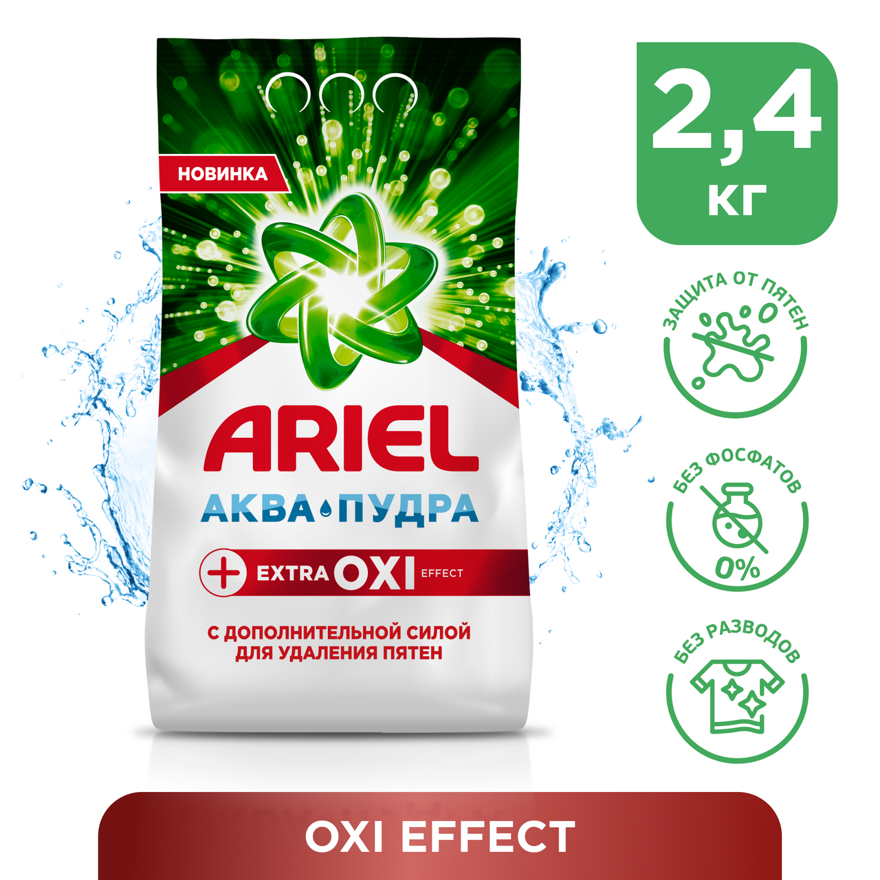 Стиральный порошок Ariel +Extra OXI Effect с технологией Аквапудра выводит чистоту на новый уровень: его формула содержит дополнительные пятновыводители и обеспечивает непревзойденный уровень чистоты Ariel. Инновационная формула Аквапудра быстро растворяется в воде и мгновенно активируется, проникая вглубь волокна и обеспечивая безупречное очищение вашей одежды.Стиральный порошок Ariel +Extra OXI Effect настолько силен, что удаляет даже застарелые въевшиеся пятна. Уникальная технология анти-разводы помогает избежать проявления остатков порошка на ткани после стирки. Ariel Аквапудра справляется со своей задачей даже при 30С. Поэтому, чтобы поддерживать белизну вещей, выбирайте средство для стирки Ariel. Стирайте вещи снова и снова и будьте уверены в результате каждый раз. Если у вас чувствительная кожа, рекомендуем обратить внимание на гипоаллергенную коллекцию Ariel для чувствительной кожи.Преимущества Ariel Аквапудра:- Стиральный порошок Ariel +Extra OXI Effect удаляет даже стойкие въевшиеся пятна- Безупречное удаление пятен с первой стирки даже в холодной воде- С пятновыводителями в составе и дополнительной пеной для более тщательной стирки- Уникальная технология Аквапудра для быстрого растворения пятен, вымывается без остатка- Стиральный порошок, который возвращает вещам первоначальную белизну- Блестяще отстирывает белое белье при температуре от 30 C- Придают одежде сияющую чистоту и приятный аромат- Ariel +Extra OXI Effect также предлагается в форме капсул Всё-в-1Безопасность превыше всего! Мы никогда не используем фосфаты или хлор. Для отбеливания мы подбираем кислородосодержащие отбеливатели и безопасные дозировки. Все активные компоненты полностью биоразлагаемы.Для большего эффекта используйте кондиционер для белья Lenor: он защищает одежду от появления катышков, потери формы и потери цвета. Теперь ваши любимые вещи прослужат вам еще дольше.