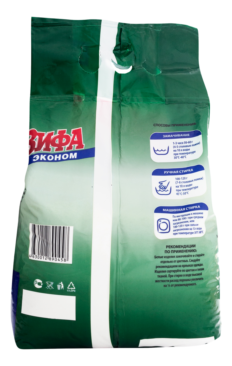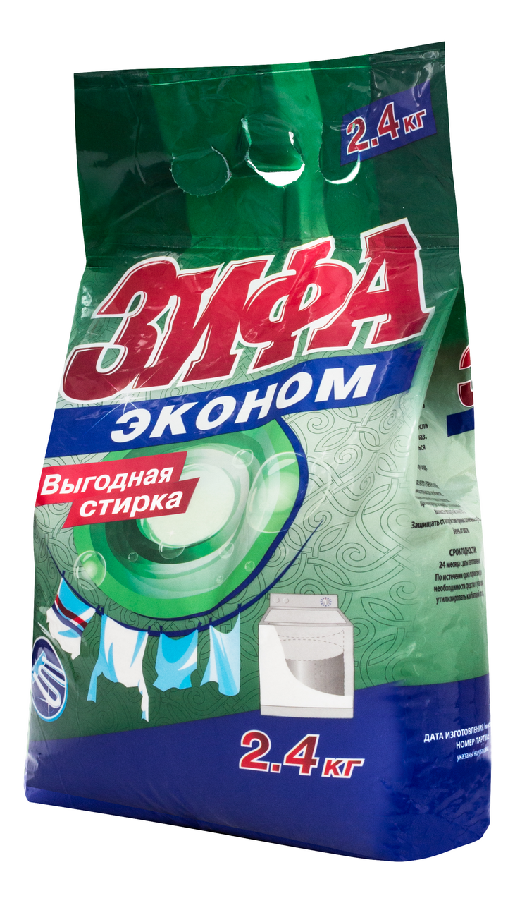 Порошок стиральный Зифа Эконом, 2.4кг - моющее синтетическое порошкообразное средство предназначено для замачивания и стирки изделий из хлопчатобумажных, льняных, синтетических волокон (кроме изделий из натуральных шерсти и шелка) в стиральных машинах активаторного типа и ручной стирки. Данное средство эффективно, без запаха, для любых видов стирки - ручной, в машинах активаторного типа, для стирки белого, черного и детского белья.
