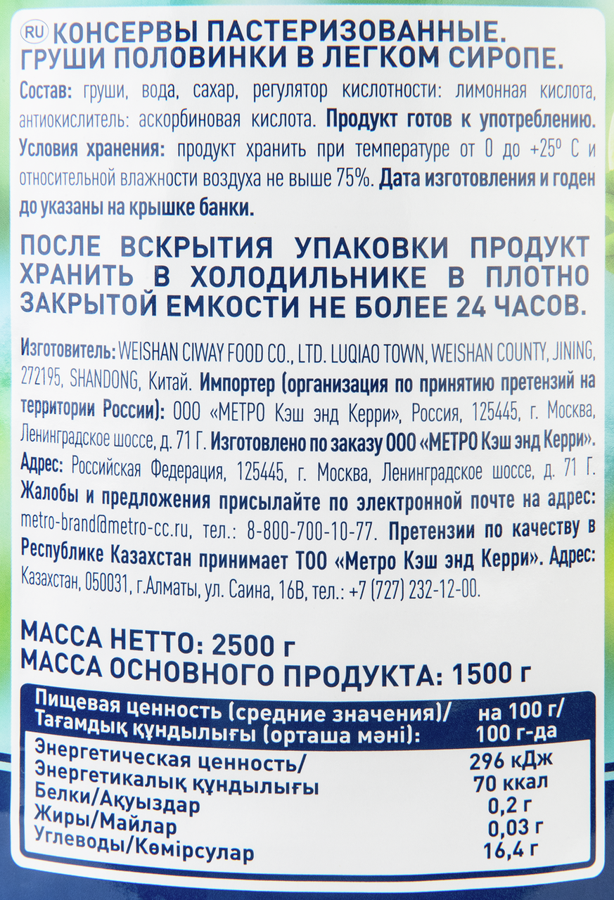 METRO Chef Груши половинки в легком сиропе, 2.5кг