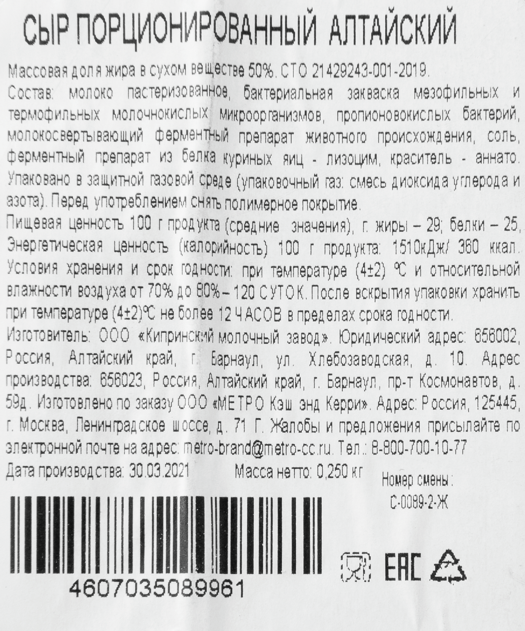 Сыр Алтайский METRO CHEF — сытный и питательный перекус, а также способ разнообразить привычный рацион. Этот продукт с плотной текстурой, нежным молочным вкусом и долгоиграющим чуть сладковатым послевкусием. С сыром можно делать бутерброды и сэндвичи, добавлять его в пиццу, пасту, использовать как начинку для блинчиков или несладких рулетов. Продукт изготавливается из отборного молока, в его составе нет растительных жиров или заменителей молочного жира. Сыр заключен в вакуумную упаковку, которая надежно защищает его от посторонних запахов, воздуха и влаги.