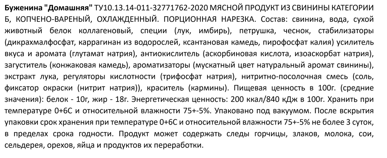 Свинина, вода, сухой животный белок коллагеновый, специи, петрушка, чеснок, стабилизаторы, усилитель вкуса и аромата, антиокислитель, загуститель, ароматизаторы, экстракт лука, регуляторы кислотности, нитритно-посолочная смесь, краситель.