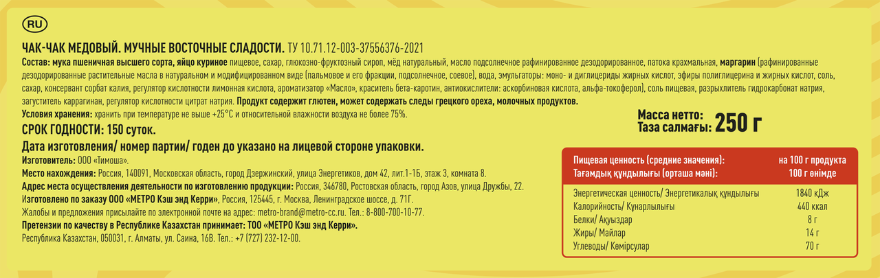Мука пшеничная высшего сорта, яйцо куриное пищевое, сахар, глюкозно-фруктозный мёд натуральный, масло подсолнечное рафинированное дезодорированное, патока крахмальная, маргарин рафинированные дезодорированные растительные масла в натуральном и модифицированном виде пальмовое и его фракции, подсолнечное, соевое, вода, эмульгаторы: моно - и диглицериды жирных кислот, эфиры полиглицерина и жирных кислот, соль, сахар, консервант сорбат калия, регулятор кислотности лимонная кислота, ароматизатор Масло, краситель бета-каротин, антиокислители: аскорбиновая кислота, альфа-токоферол, соль пищевая, разрыхлитель гидрокарбонат натрия, загуститель каррагинан, регулятор кислотности цитрат натрия.