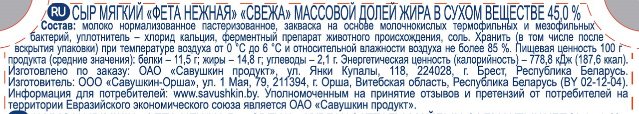 Сыр Sveza Фета Нежная мягкий 45%, 250г