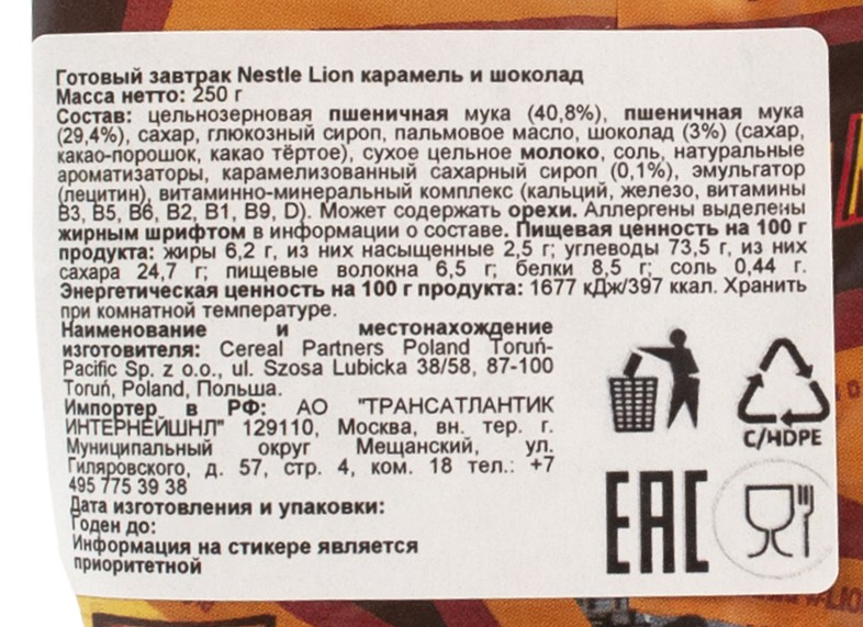Цельнозерновая мука (40,8%), пшеничная мука (29,4%), сахар, сироп глюкозы, пальмовое масло, шоколад (3%) (сахар, какао, какао-ликер), обогащение (минерал: кальций), цельное молоко в порошок, соль, натуральные ароматизаторы, карамелизированный сахарный сироп (0,1%), эмульгатор (лецитины), обогащающие вещества (минерал: железо; витамины В3, В5, В6, В2, В1, В9, D). Может содержать орехи.