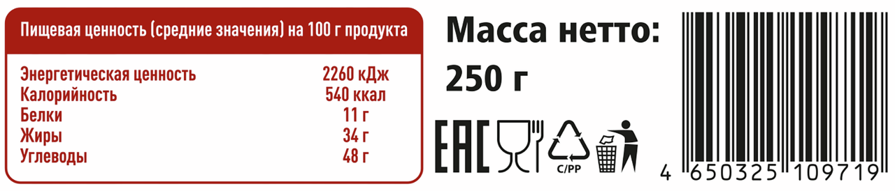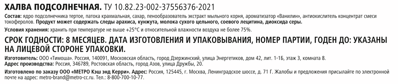 Ядро подсолнечника тёртое, патока крахмальная, сахар, пенообразователь - экстракт мыльного корня, ароматизатор Ванилин, пищевой натуральный антиокислитель - концентрат смеси токоферолов.