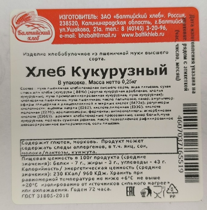 Хлеб Балтийский хлеб кукурузный, 250г