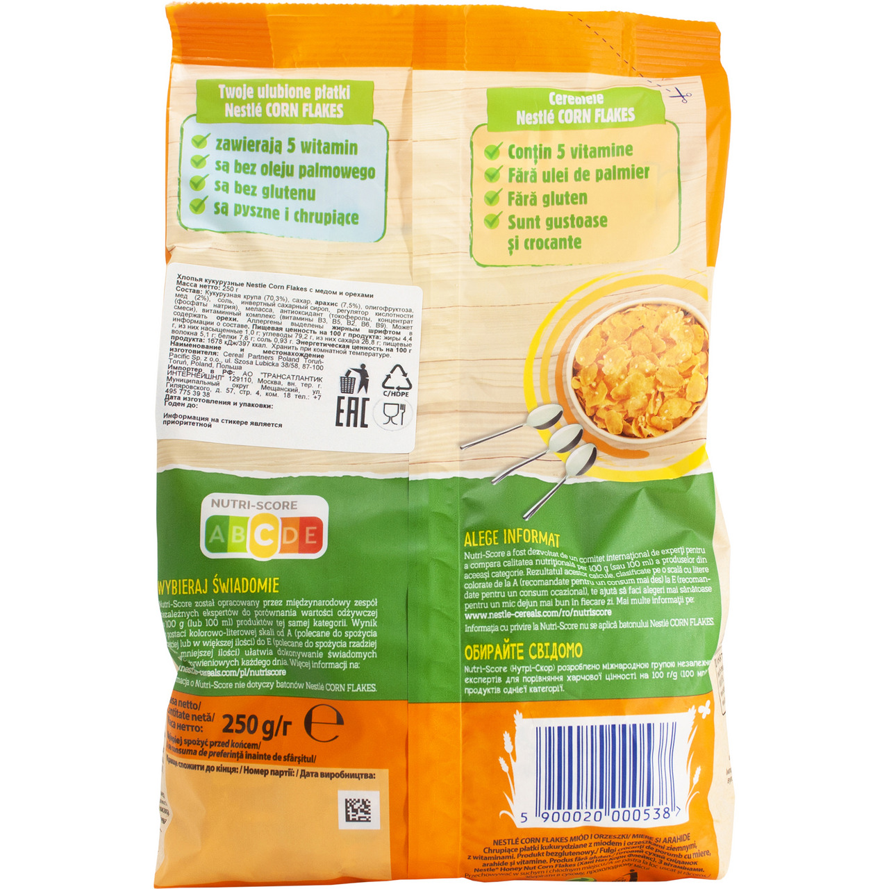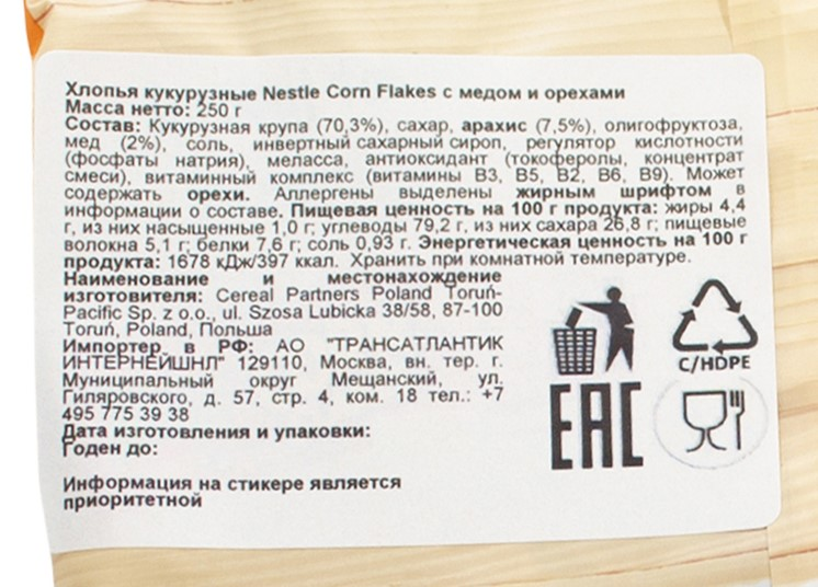 Готовый завтрак Nestle Хлопья кукурузные Мед-орехи без глютена, 250г