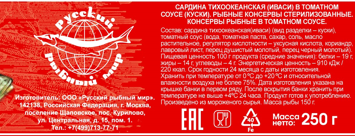 Сардина тихоокеанская Русский Рыбный Мир Иваси в томатном соусе, 250г