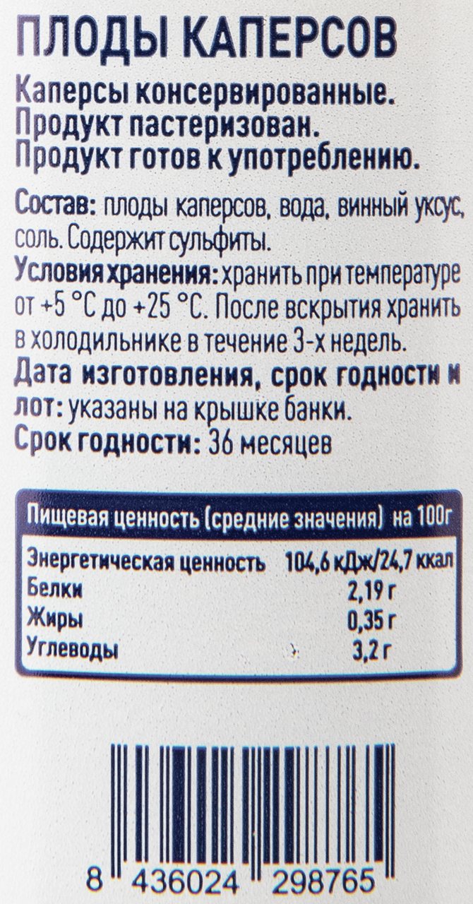 Плоды каперсов, уксус, вода, соль, содержит сульфиты.